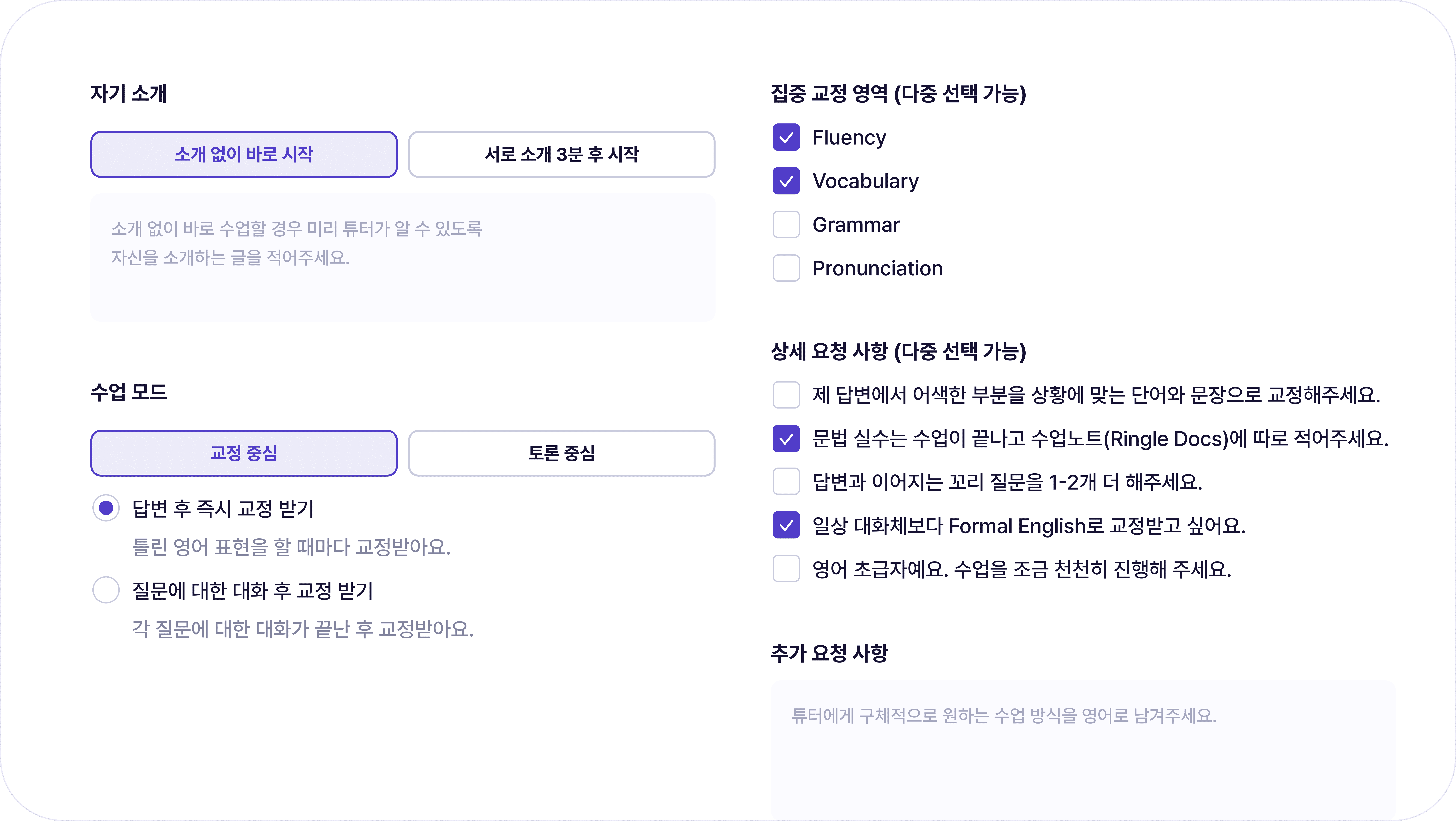 수업 모드(교정 중심 / 토론 중심)부터, 집중 교정 영역, 그리고 상세 요청 사항까지. 목적에 맞춰 수업 방식을 설정해보세요.