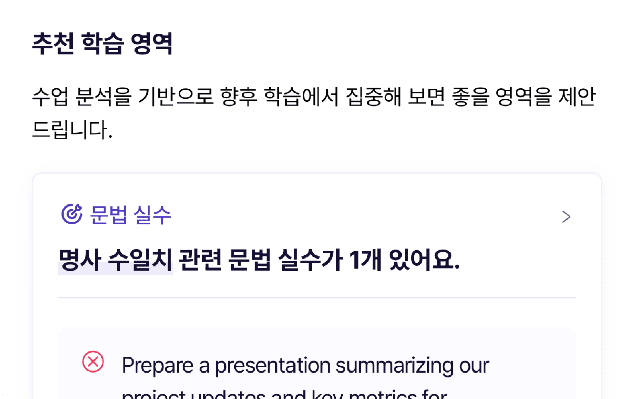 복잡성, 정확성, 유창성 분야에 대해 영역별 개선의 영역을