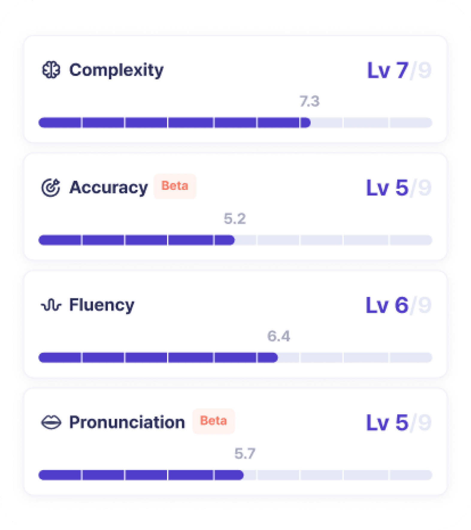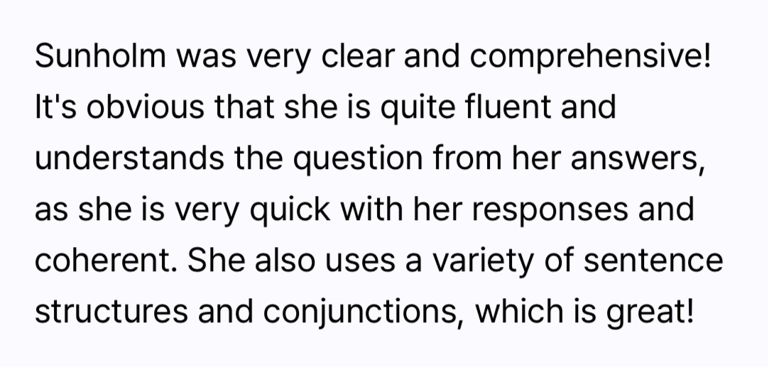 링글의 AI 분석은 IELTS와 유사한 구조로 영어 실력을 진단하고 있으며, 이화여대 임동선 교수님 연구실과의 공동연구를 통해, TOEFL, TOEIC 스피킹 점수와의 0.7 이상의 높은 상관 관계를 검증받았습니다.
