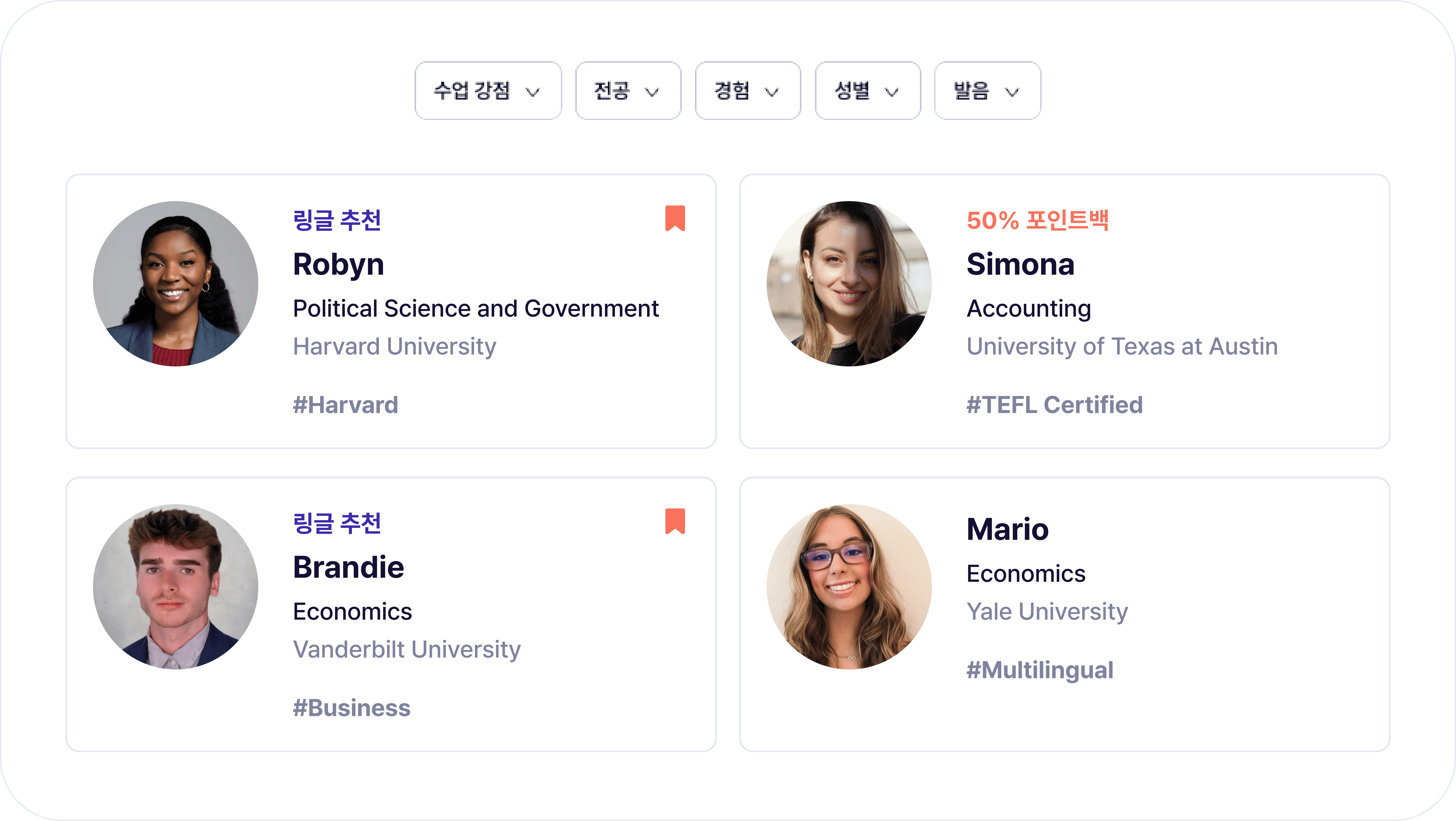 수업 강점부터 전공, 업무 경험, 성별, 그리고 발음까지. 나와 잘 맞는 튜터와 수업하세요.