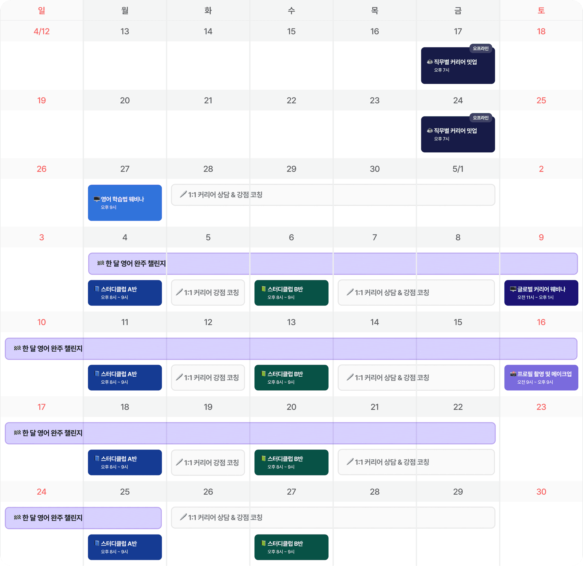 5월 한 달간 학습 미션을 완주만 해도 전원 스타벅스 쿠폰 증정, 목표 기업 합격 인증 시 정가 140만 원 상당의 수업권까지.