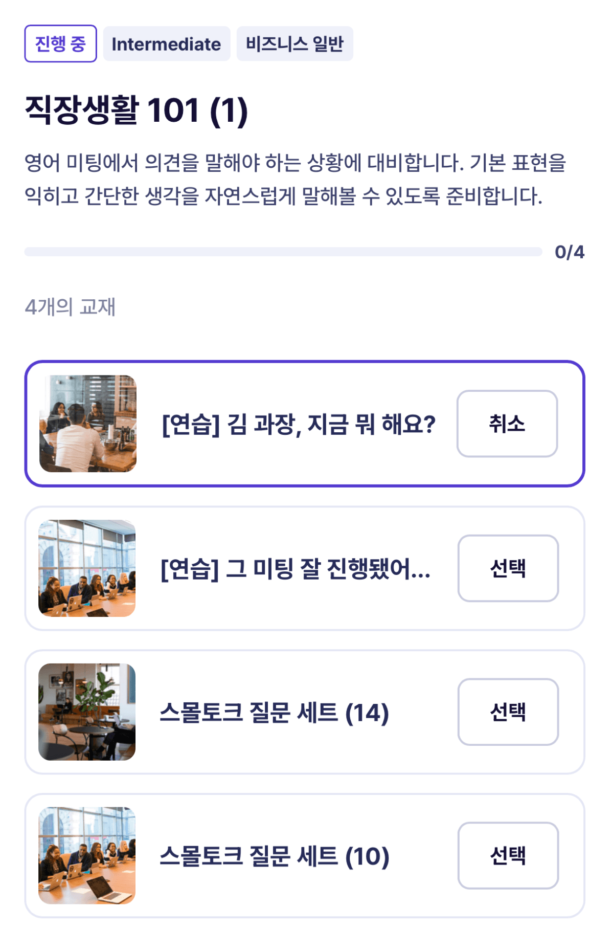 평일 저녁 1시간 정도 4-5명 소규모 그룹으로 나뉘어 정해진 주제를 가지고 스피킹을 연습합니다.