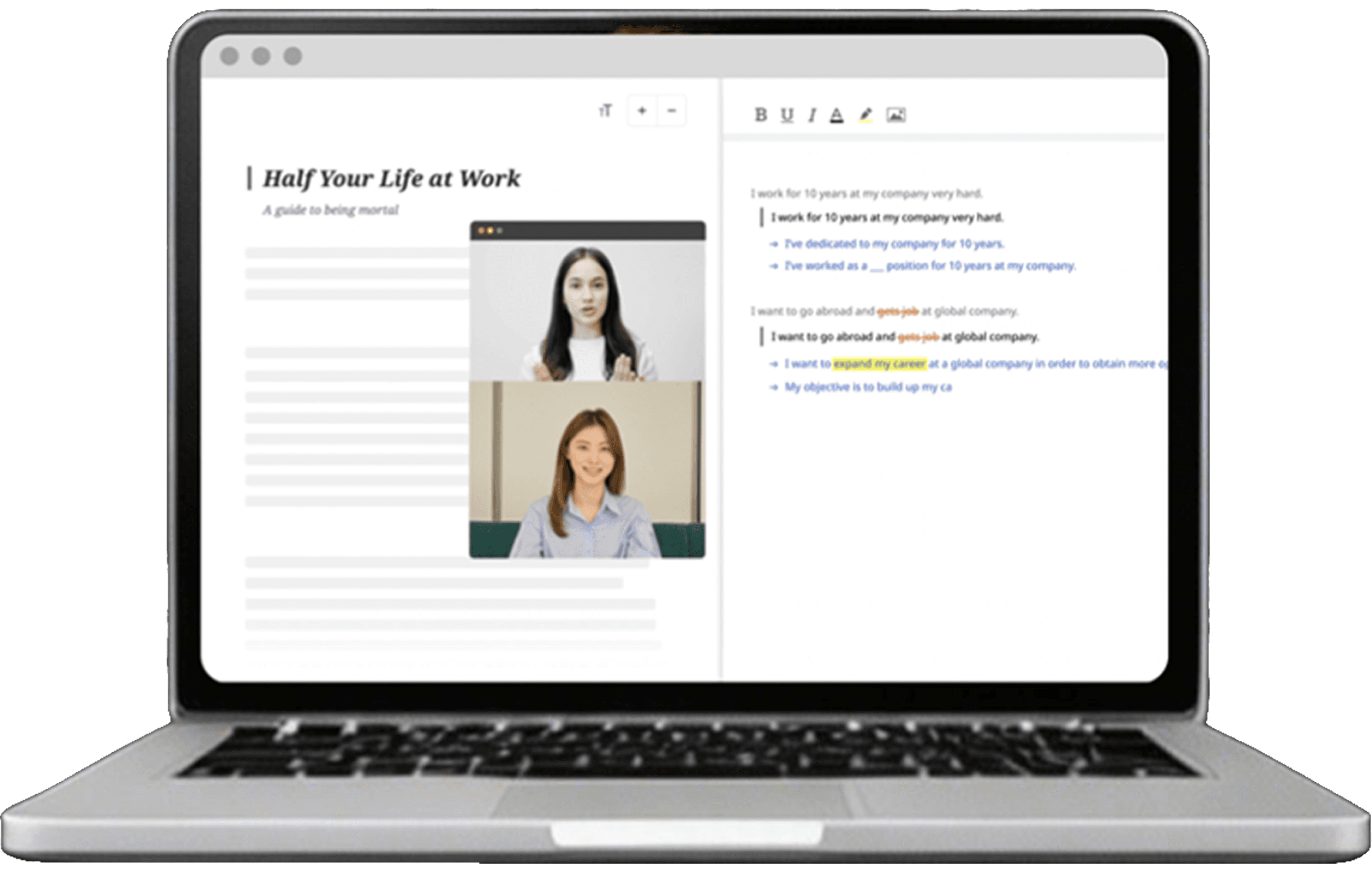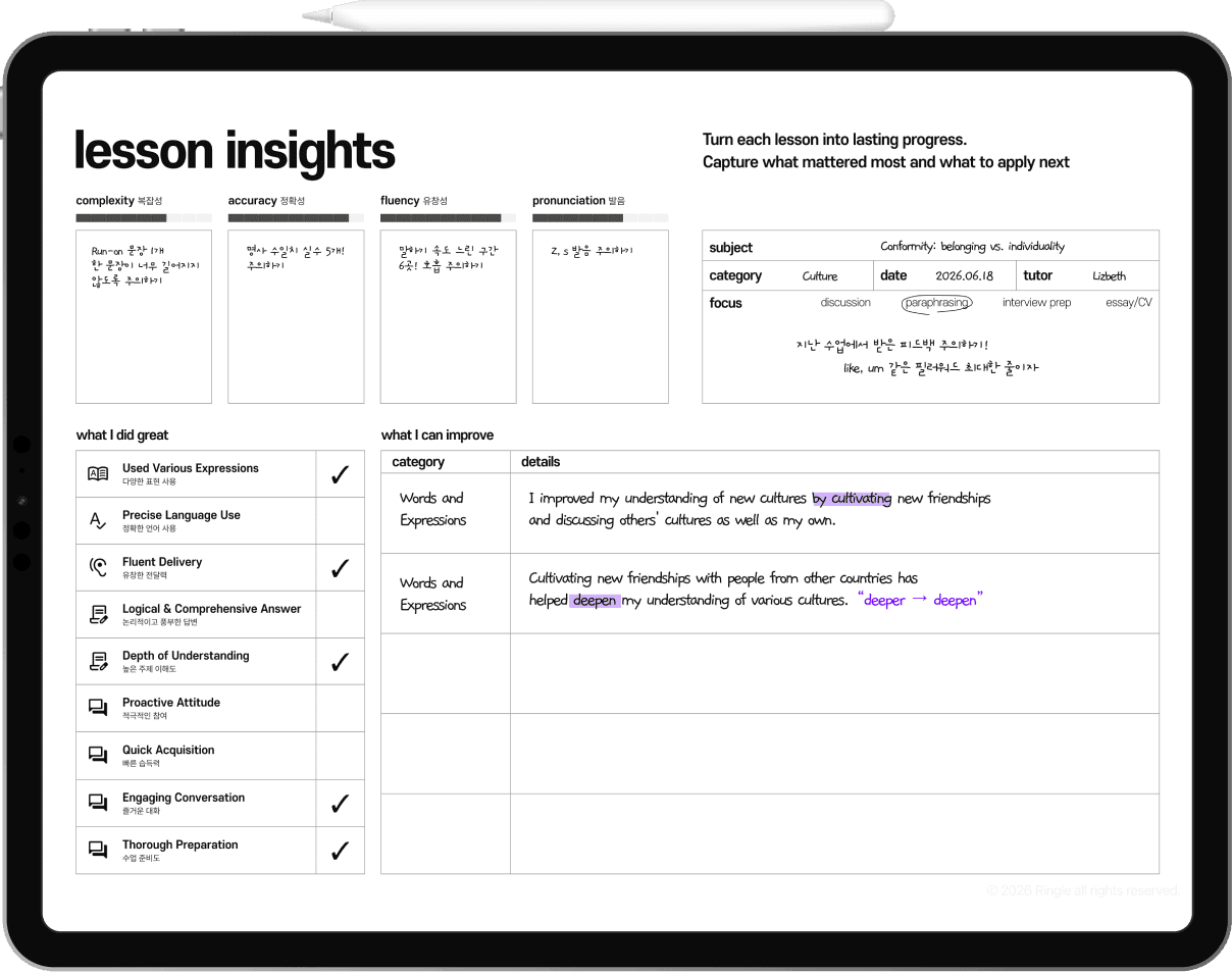 수업 중 사용하는 링글 닥스. 튜터가 교정을 적으며 알려줘요.