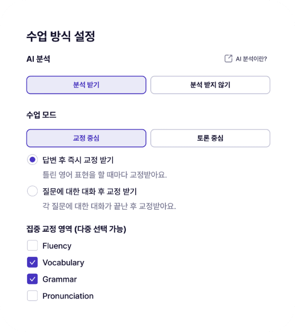 문법 오류부터, 발음 실수까지. 내 영어 중 틀린 부분을 문장 단위로 보여주어 정확한 개선이 가능합니다.