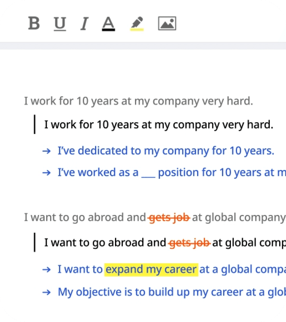 문법적으로는 맞더라도, 예의가 없고 자기중심적으로 느껴지는 표현들을 하버드 튜터가 원어민이 실제로 사용하는 상황에 맞는 표현으로 교정해줘서, 영어 면접을 꼼꼼히 준비할 수 있었어요.